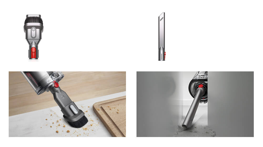 Your Dyson Cyclone V10™ vacuum comes with a set of specialised tools, to remove dirt from all over your home. They click on and off easily, with quick-release catches.