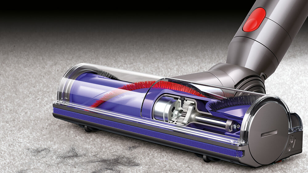 מברשת ממונעת בעלת סיבי ניילון קשיחים הנכנסים עמוק לתוך השטיח להסרת לכלוך שקוע ושיער של חיות מחמד, וסיבי פחמן אנטי-סטטיים רכים להסרת אבק דק מרצפות קשות.
