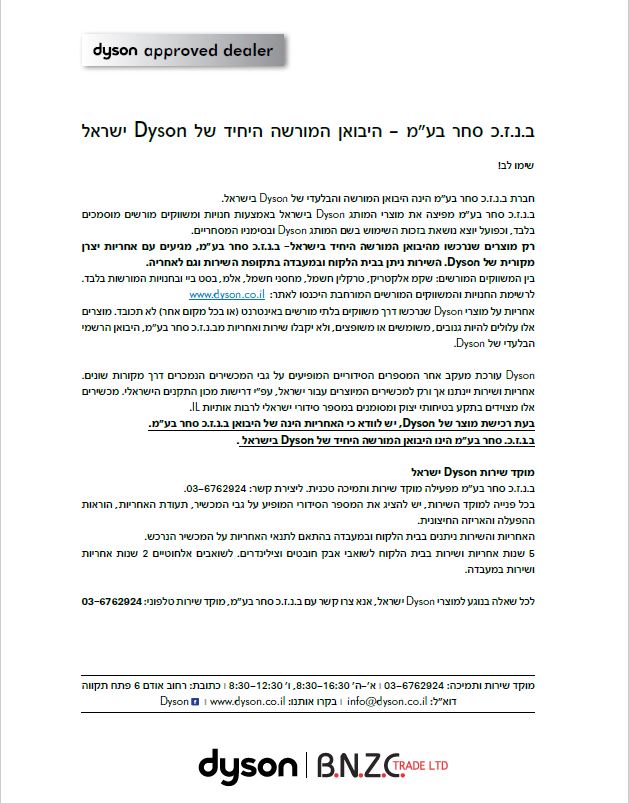 הקפד לדרוש את האחריות החוקית והרשמית מהיבואן המורשה של Dyson, ב.נ.ז.כ סחר ושיווק בע"מ